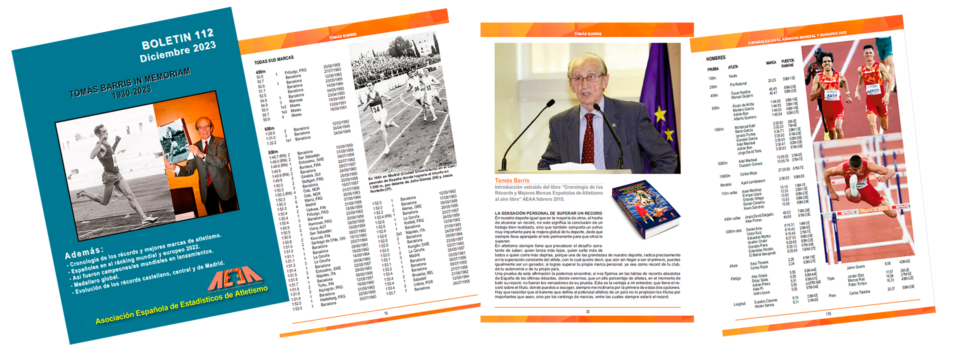 Acaba de publicarse el boletín nº 112 de la AEEA que está en gran parte dedicado a la figura de Tomás Barris, atleta de leyenda y compañero de la Asociación, fallecido el pasado 29 de octubre a los 93 años de edad. En esta primera parte del boletín se repasa exhaustivamente su trayectoria atlética, con una gran colección de fotografías y colaboraciones de personas que pudieron coincidir con él a lo largo de su recorrido en nuestro deporte. Sin duda, un más que merecido homenaje a una figura irrepetible del atletismo español.